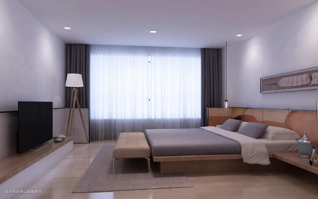 如果卧室空间比较紧凑,并且没有什么特殊的喜好,也可以把床尾墙留空,保持空间的宽敞通透;