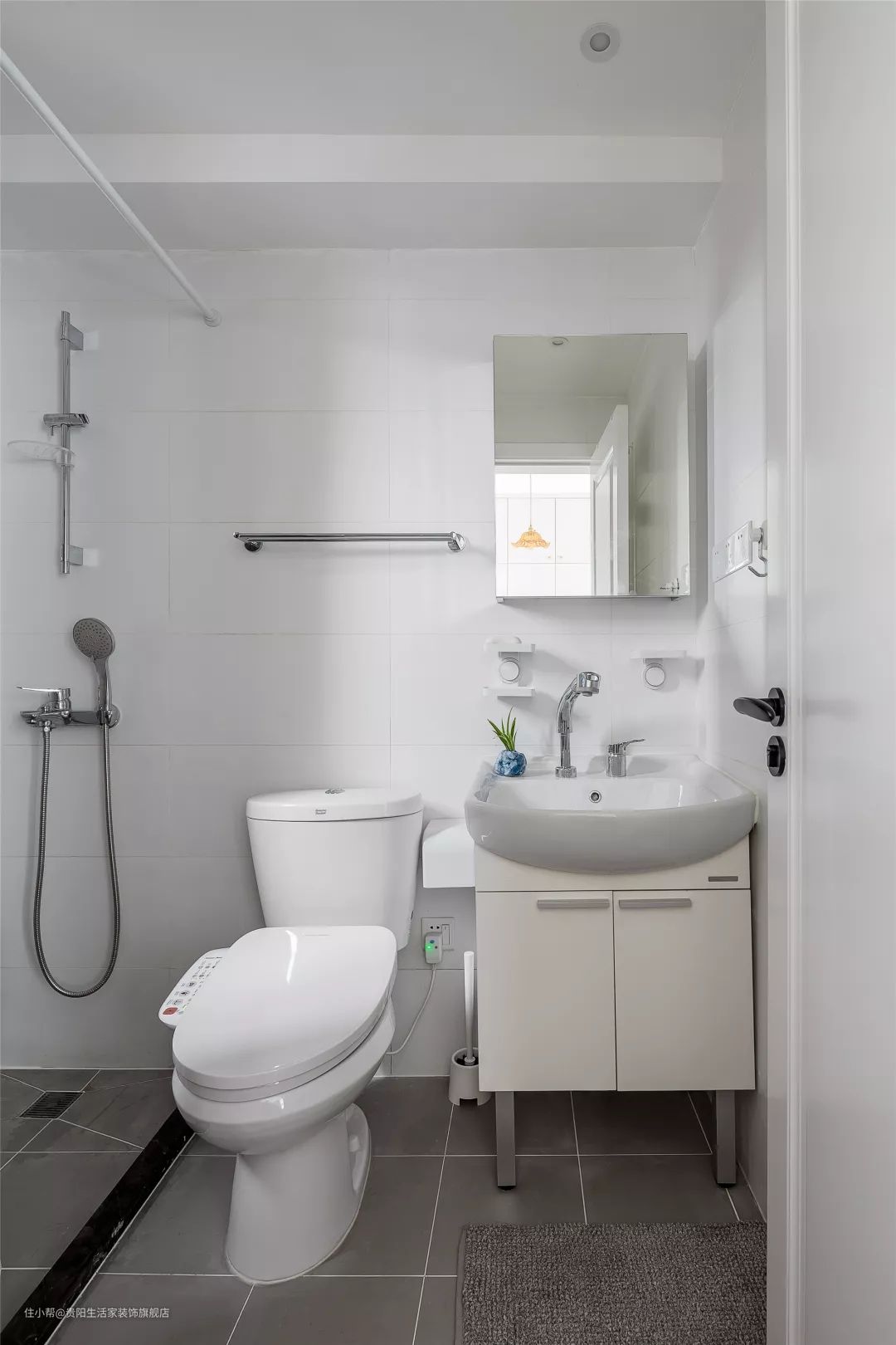 主卫做了干湿分离的设计,洗手台的尺寸选择了更为迷你的,方便摆放下马桶和淋浴房。灰色和白色结合的卫生间给人一种简约、轻松的感觉。