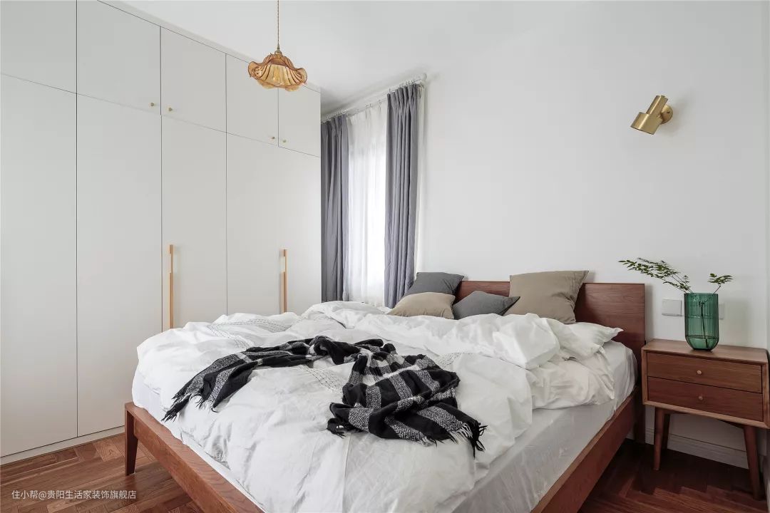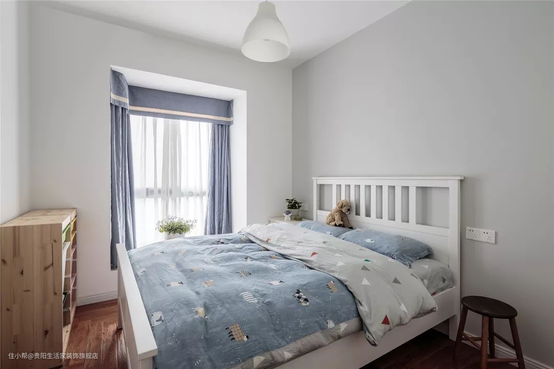 次卧的墙面被刷成了灰色,白色的木床搭配木色的柜子,床品和窗帘选择了蓝色的款式,让次卧看起来更有小清新感。