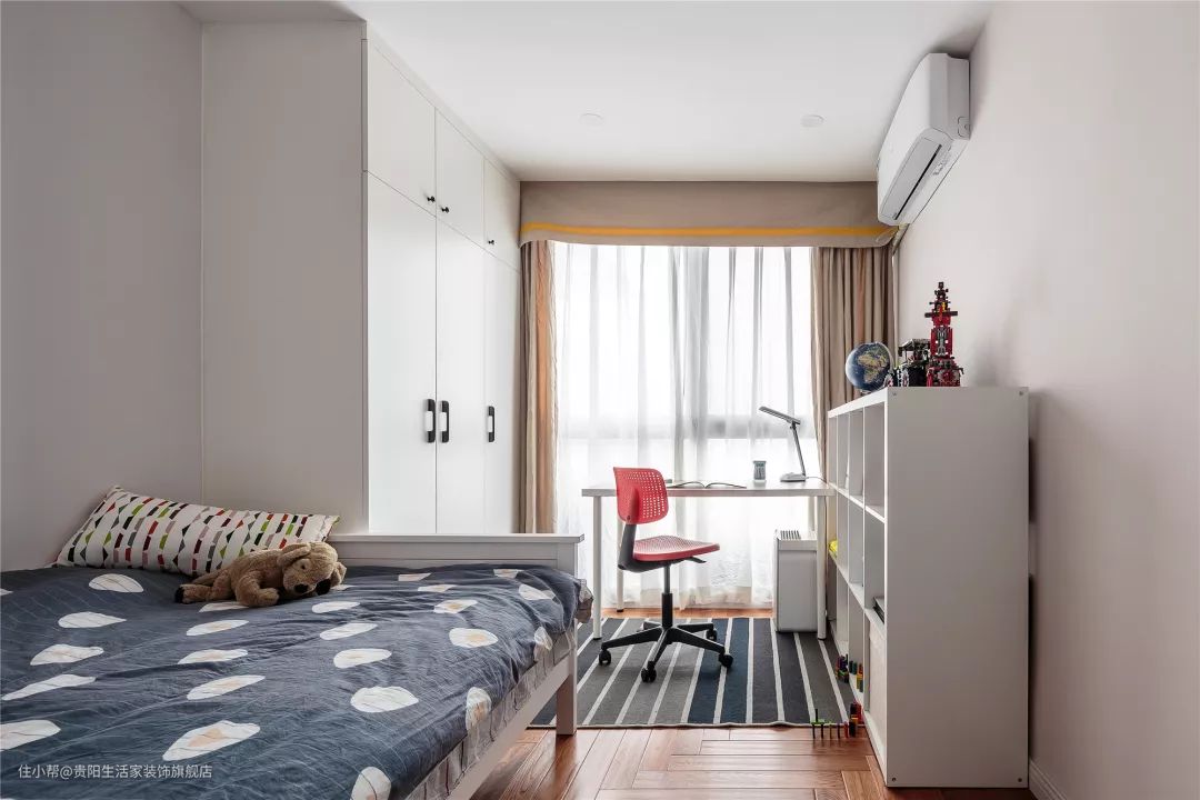 儿童房的床靠着角落摆放,然后把书桌、书柜和衣柜都放在了靠近窗户的位置,这样平时做作业的时候,也有个更好的采光条件。