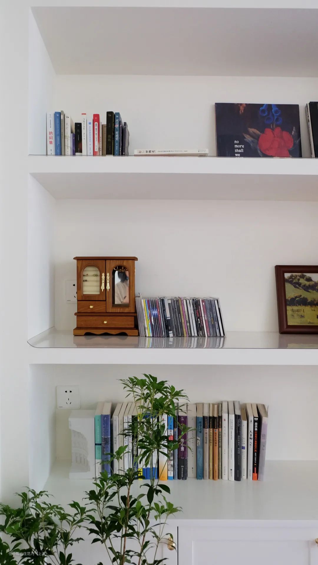 开放收纳难免担心落灰的问题,为了更好清洁,设计师在每一层隔板上都放了透明的PVC隔垫,这种PVC垫又被称为玻璃桌布,没有异味,用久了也不会发黄。
