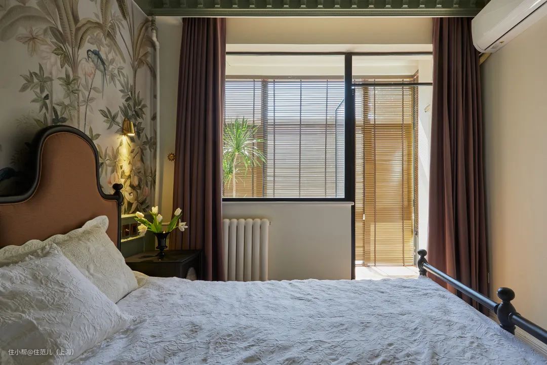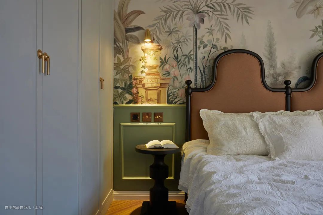 主卧摆了一款老巴黎双人床,床头的软包部分保证了高背床的舒适性,睡前的阅读都变得柔软起来。