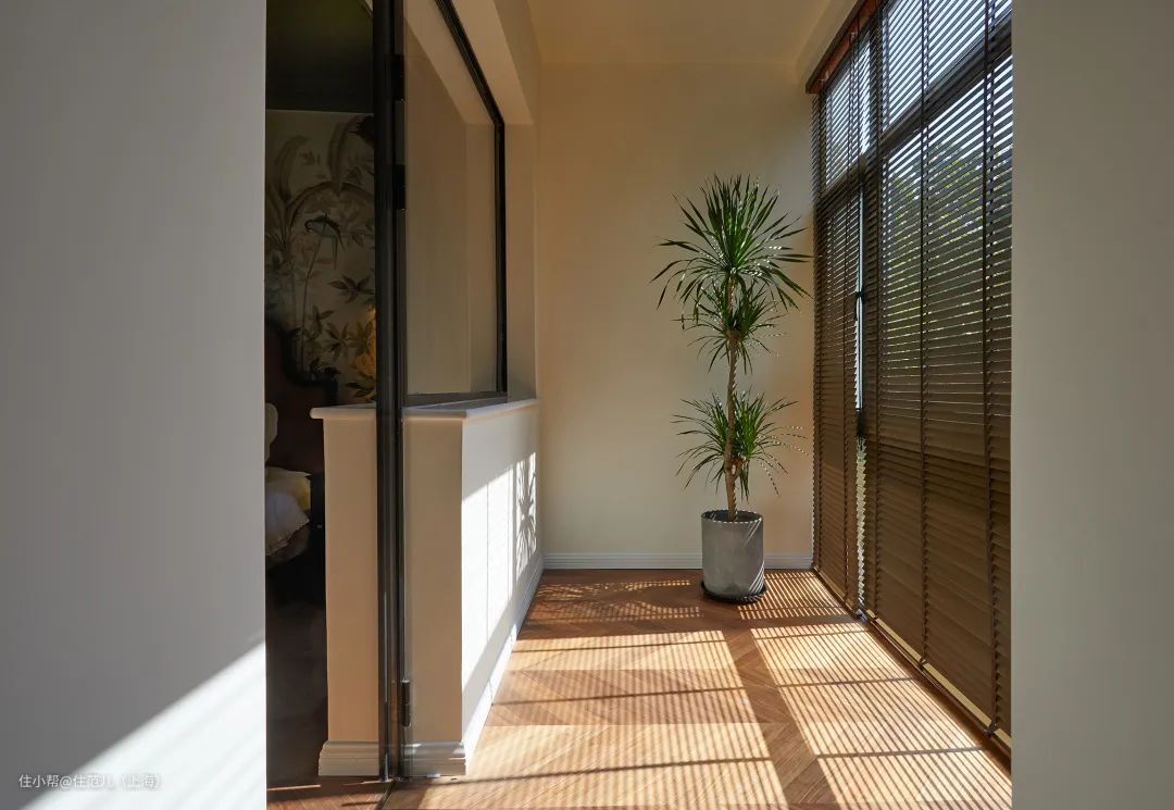 阳台使用深胡桃木色百叶窗,配合一株散尾葵,让这个角落富有生气。