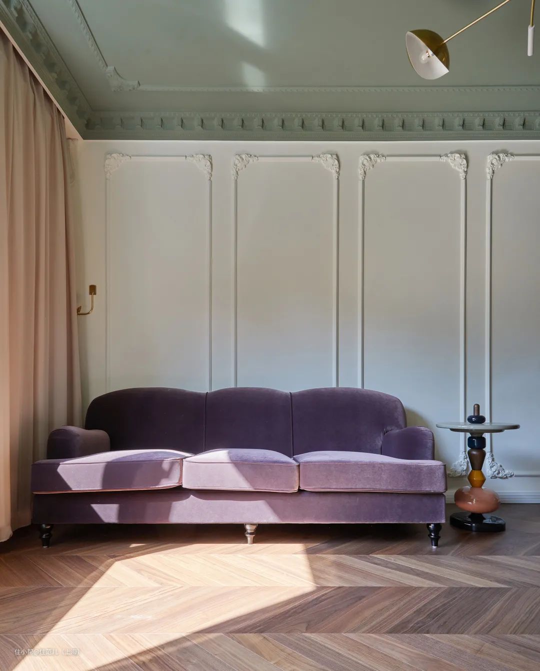 在窗帘的搭配上,设计别具巧思,把纱帘放在里层,柔和裸色的纱帘质地轻透,搭衬绿色屋顶、紫罗兰的丝绒沙发,调和出温甜不腻的生活气息。