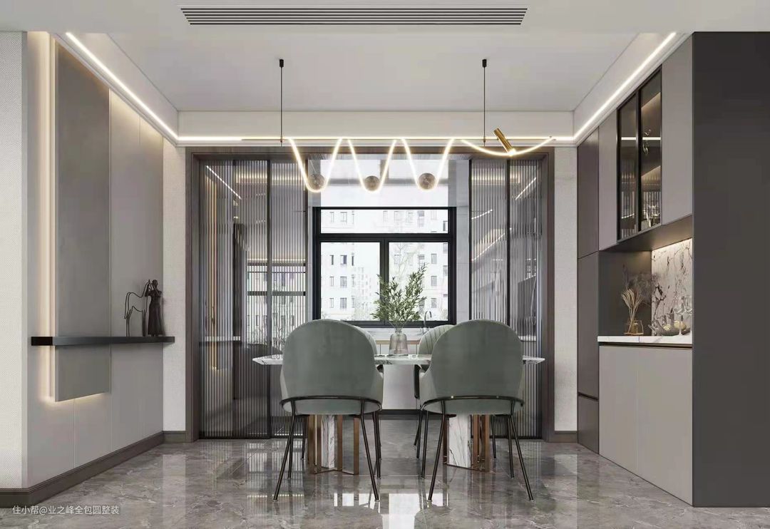 餐厅沿用了客厅的浅色调,抹茶色的椅子使得和客厅相呼应,酒柜使得整个空间更加通透。