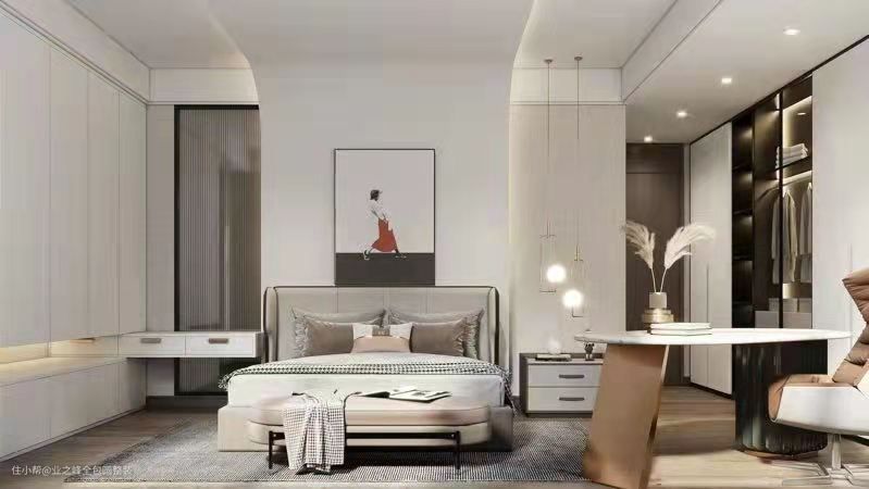 卧室的空间搭配十分简洁,色调明了,主题明晰,床头背景采用浅色底景,加之装饰画,搭配简约吊灯,静中又不缺乏雅致卧室的素雅和顺来自软装配饰之间的和谐默契,没有刻意的强调设计感。