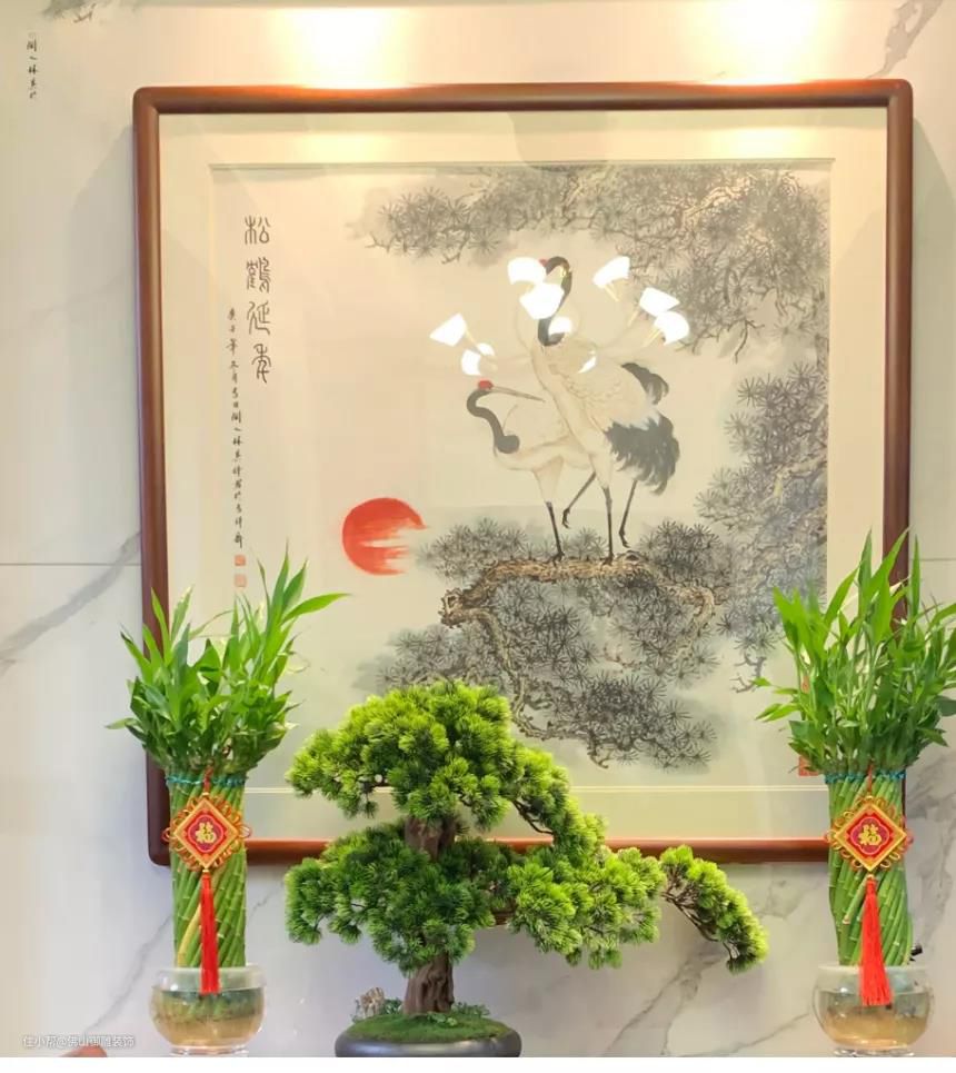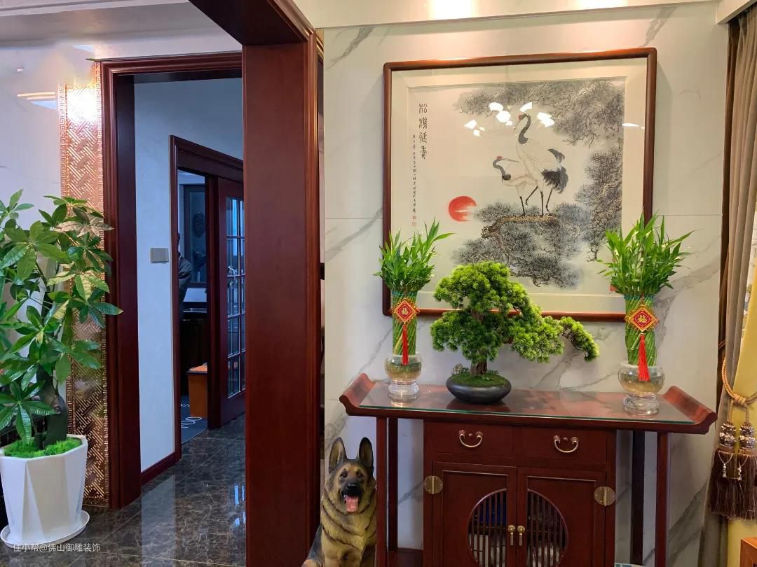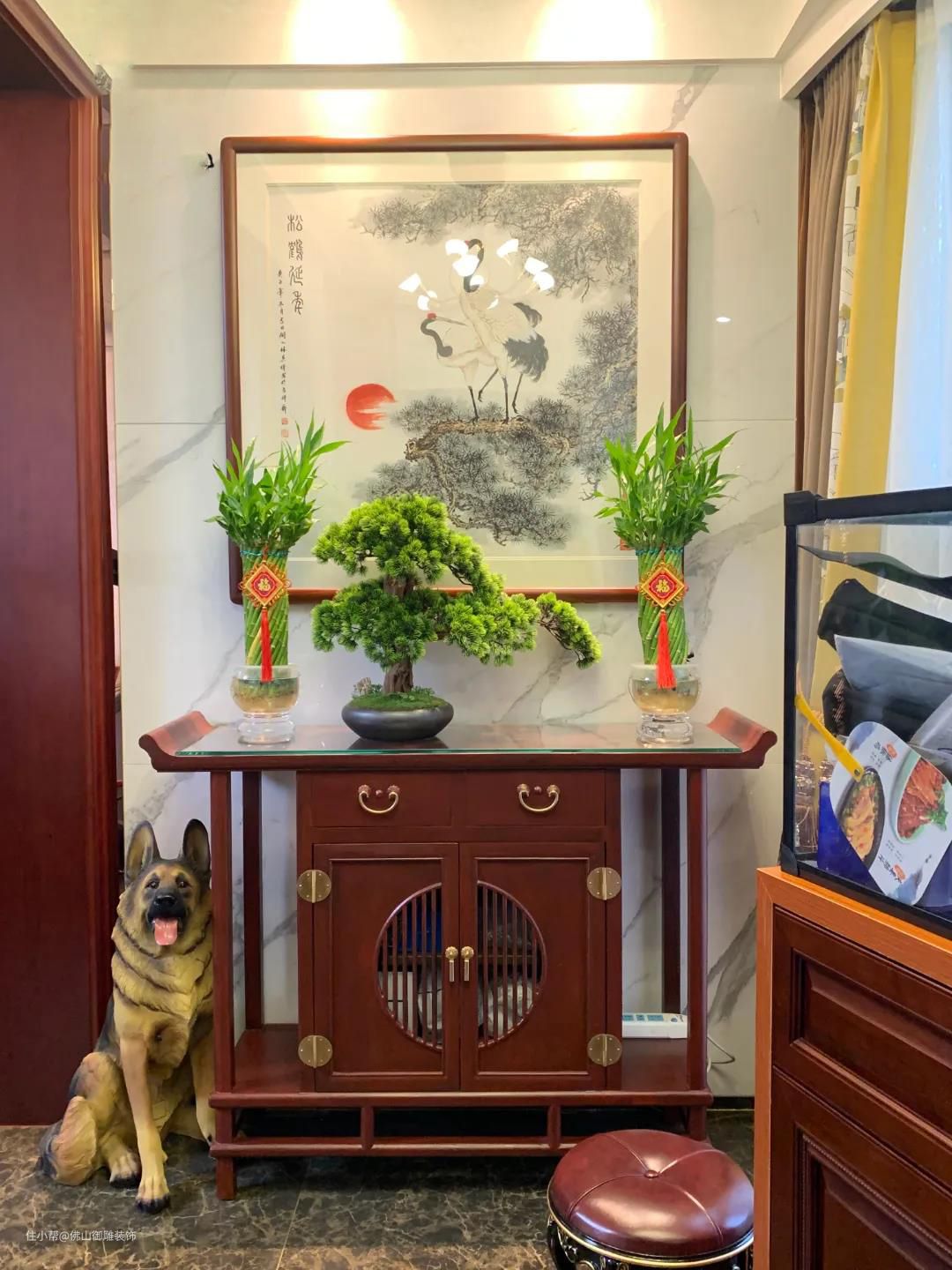 憨态可掬狼犬模型灵动可爱,还有台面上的迎客松和两盆绿植,格外显眼。墙上的仙鹤延年水墨画,彰显出整个玄关空间端庄正气,户主热情好客!