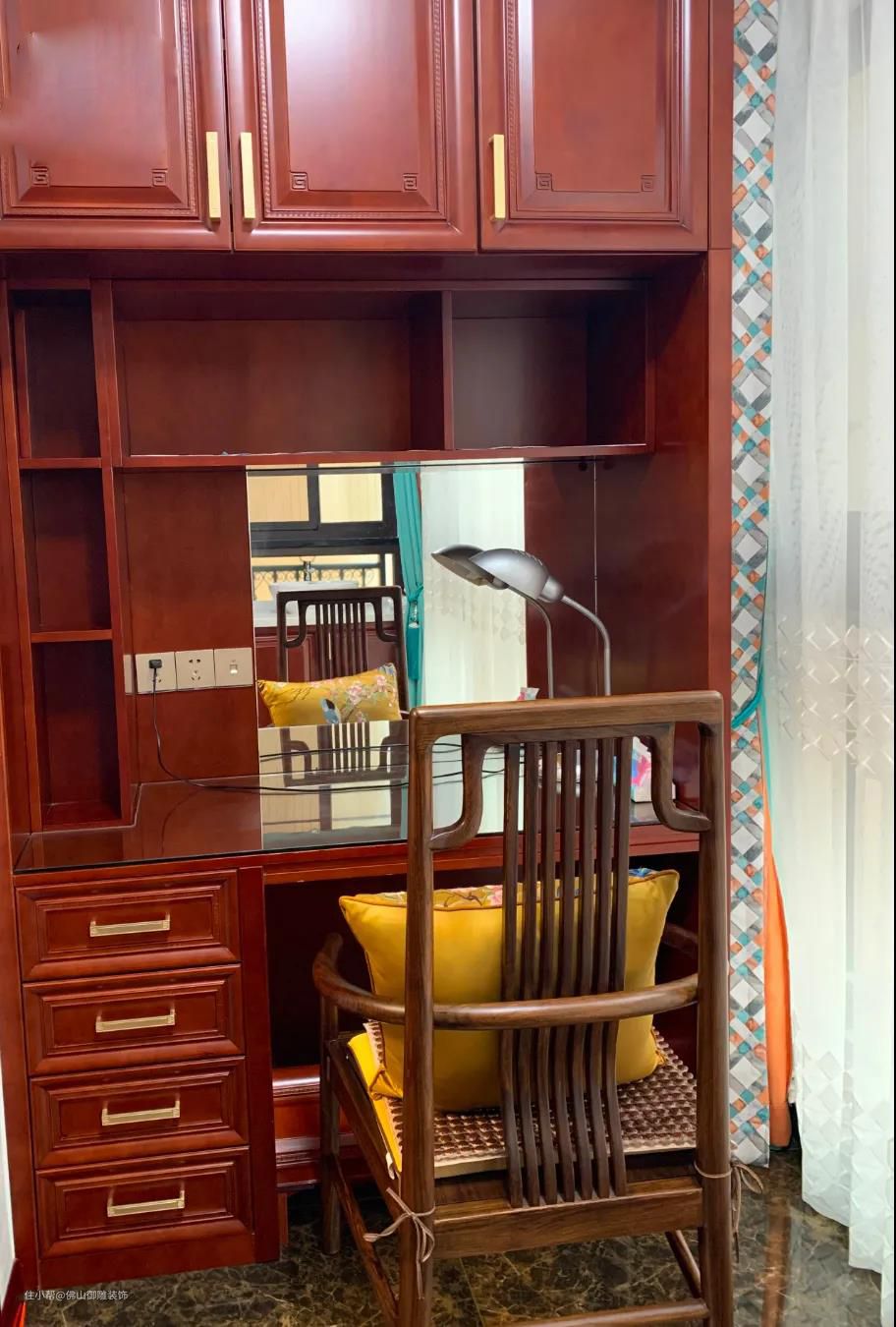 主卧阳台改造成一个小书房和洗手台,中式的椅子和窗帘搭配,古典风味惬意至极。