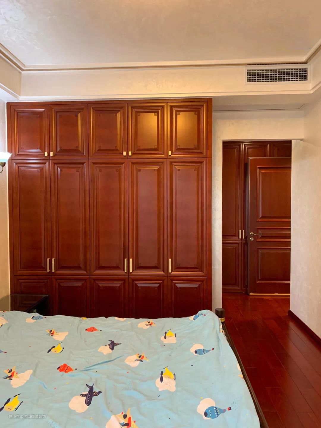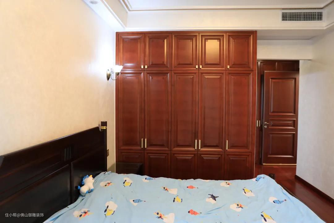卧室是主要的休息场所,屋主人选用暗色系的大床和红木衣柜,起到镇静清神,安然入睡的效果。