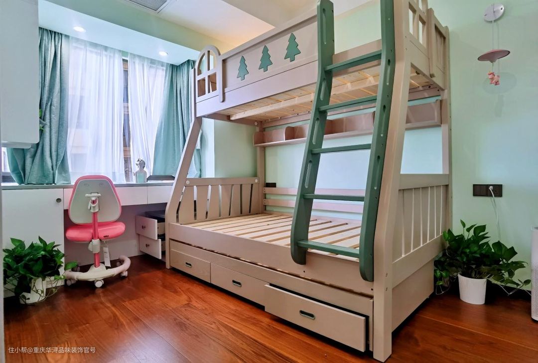 这套儿童房选用原木色的上下双床,显得温馨干净。绿色的梯子和房屋整体的色调呼应,在床身上还用镂空的工艺做出松树等具象的卡通造型,让空间更加充满童真。