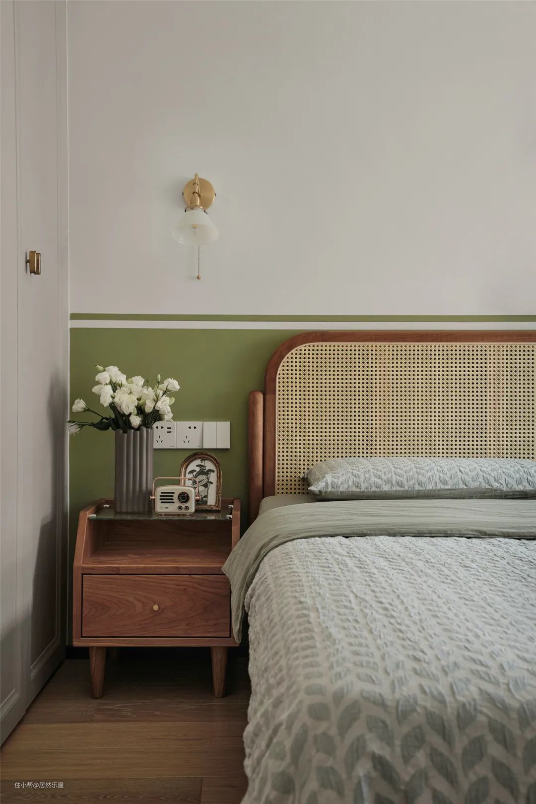主卧设计配色更为清新,藤编的床头搭配棉麻的床品四件套,清爽又舒适。到顶式衣柜,收纳空间大又解决了清扫难题。