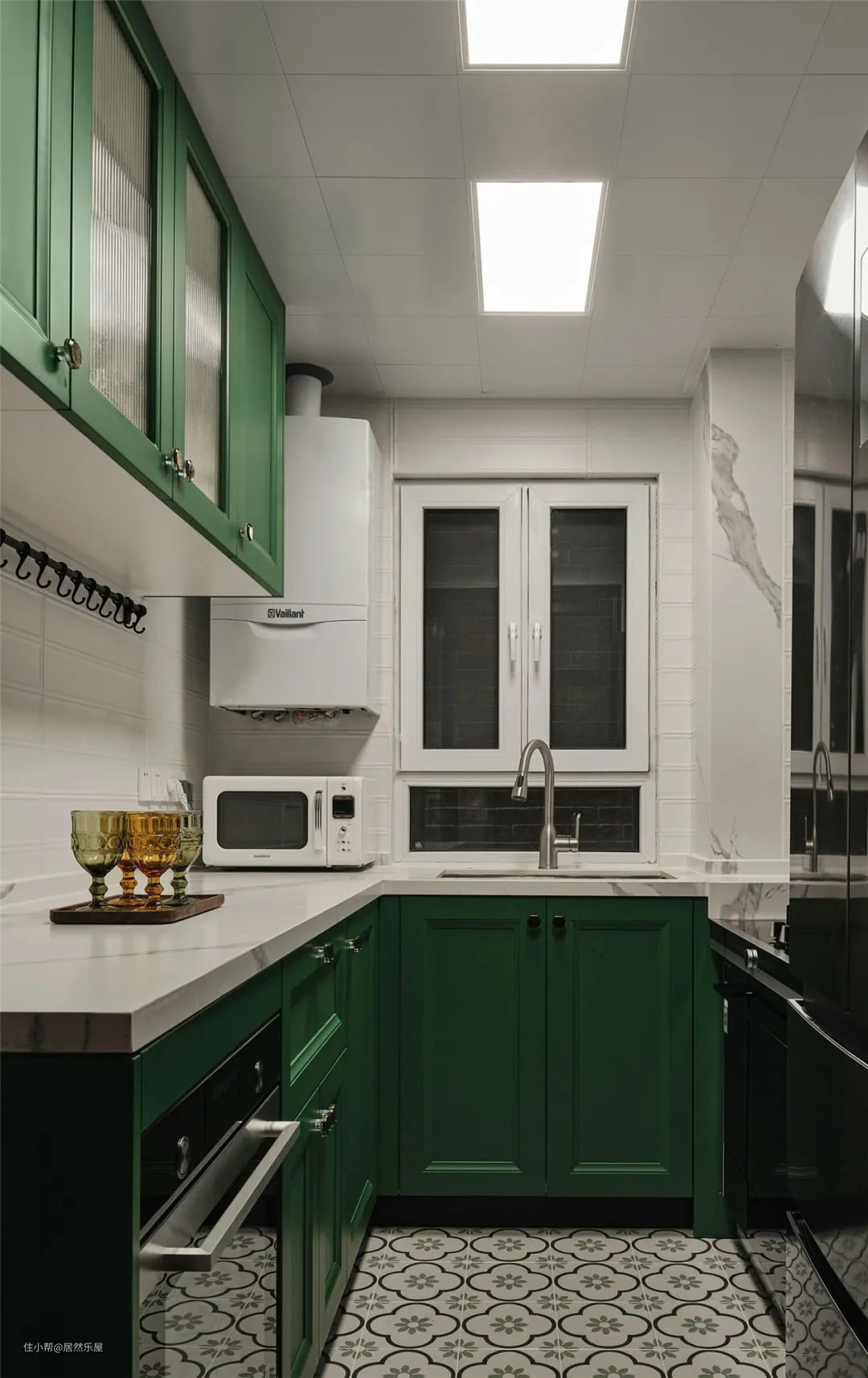 厨房空间设计,延续了客厅的配色风格,拼色地毯换成了更耐脏的小花砖,L型布局设计,洗-切-炒动线流畅,台面上方加装了一组吊柜,解决了厨房收纳难题。