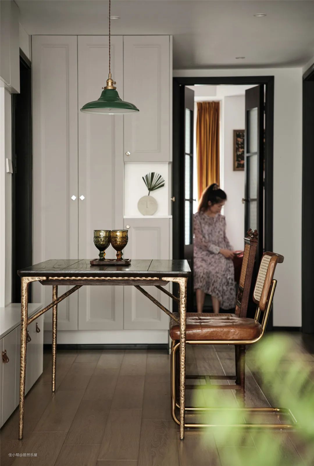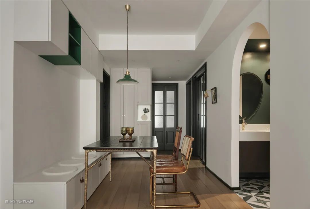 餐厅卡座上方的悬挂柜,特意留出一组开放式绿色柜,与绿色吊灯相呼应,既增加了收纳空间,又提升了时尚品味,功能与装饰两全其美。