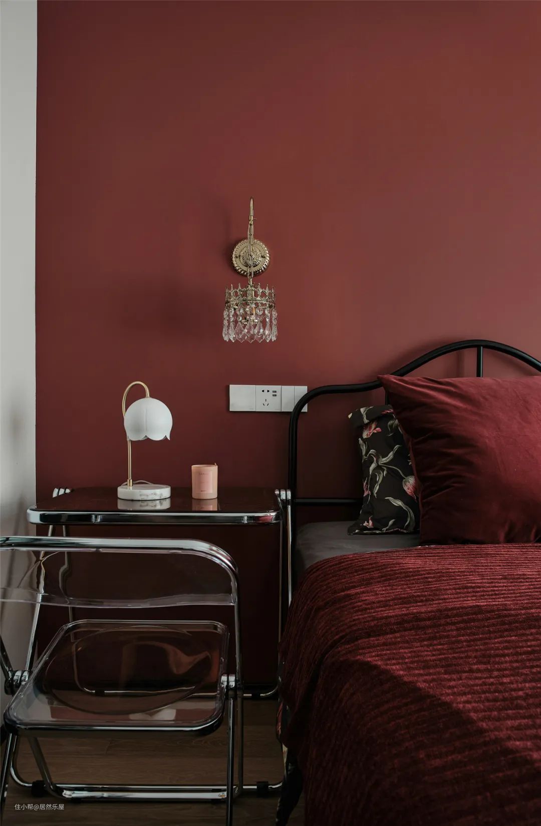 客卧空间复古感更重,复古摩登红搭配丝绒让人一秒穿越回过去。