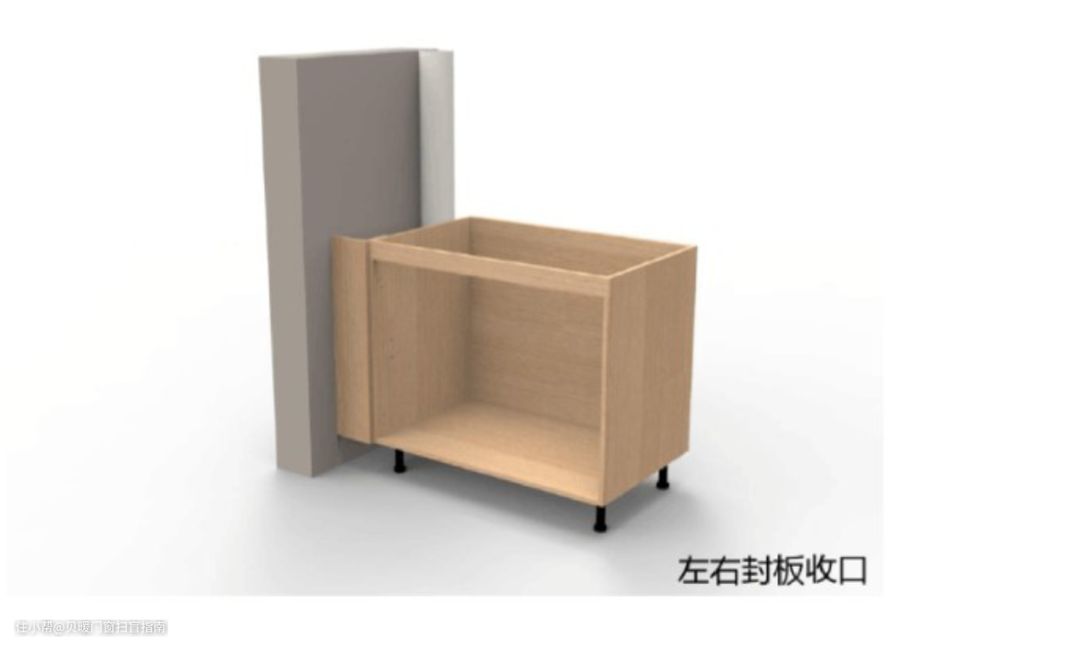 ②管道、烟道墙体在左右侧,障碍物宽度大于150mm,深度小于400mm进行柜体调整,柜体左右切角,需要单独做L型板,转角位置加尼龙调节角。背板无法安装。