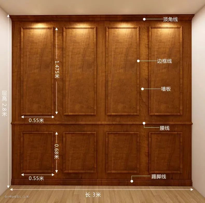 一套集成墙板包含墙板、踢脚线、装饰线条等配件,都做成固定尺寸的模块,在现场直接组装,多余部分裁掉就行。