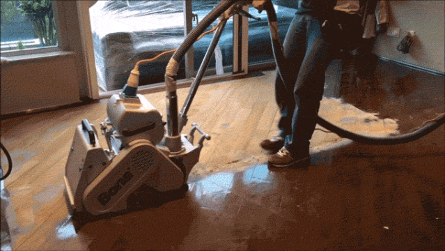 第二步,工人先用打磨机打磨地板,再用40目、80目、120目的砂纸逐次打磨三次,目数越大,砂纸颗粒越小,打磨留下的划痕越不明显。