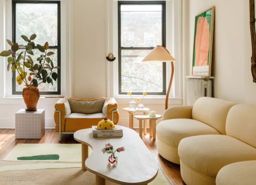 尤其是近年流行的奶茶风,亲切的肤感裸色,和精装房的咖啡色、棕色木地板都属于同一色系,搭在一起没有违和感。