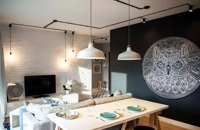 北欧风格的大白墙大白顶,搭配细细的黑色电线,简约到极致,其实不难看。