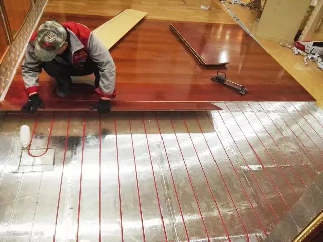 电热膜,把电线嵌在膜里,干式铺装,不能接触水泥,因此电热膜地暖上面不能铺瓷砖,只能铺木地板。