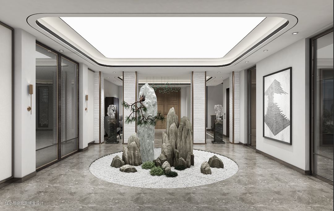 中庭是整栋别墅中没有直接采光的部分,设计师在顶部模仿天光,打造出天光云幕,山石耸立的中庭美景