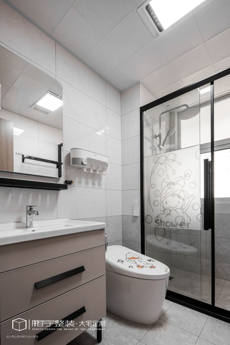 移步至卫生间,顺畅的动线衔接各功能区。定制温润的木质台盆柜增加储物的同时亦给硬朗的空间带来不一样的视觉感受。