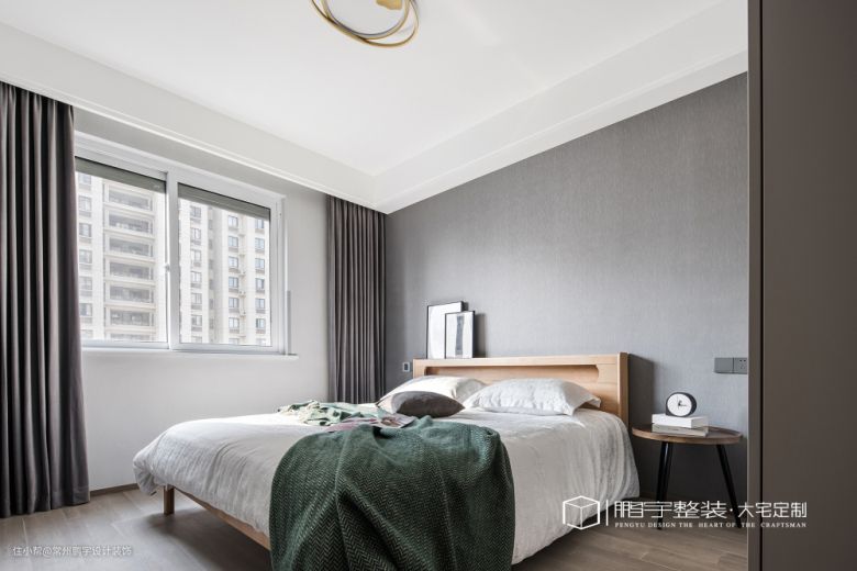 清晨的阳光透过窗洒进室内,虚实转换间灰色晕染出舒适安逸的氛围,搭配木质家具与纯白色棉质床品,简约自然提升空间质感。