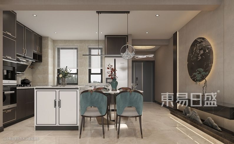 厨房餐厅一体化设计,空间采用传统中国风与现代元素相碰撞,格调典雅质朴,配色稳重成熟,布局错落协调,橱柜勾线体现出浓浓的中式韵味,蓝色餐椅的点缀恰到好处,令空间通透大气;软装看似简单且随意,却质感十足,装饰画、灯带、花插都融入空间中,成为不可或缺的重要笔触。