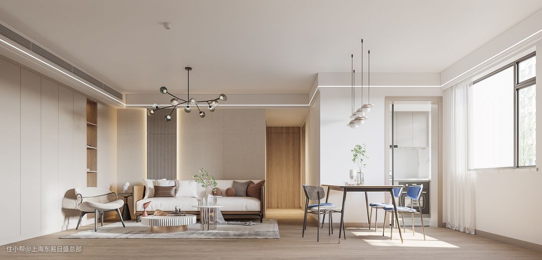 原始户型面积不大,客餐厅只有一个采光面,所以设计师通过多处添加线性灯带,来营造通透敞亮的空间,利落的线性护墙板让整个空间疏密有致,同时也更具现代感。