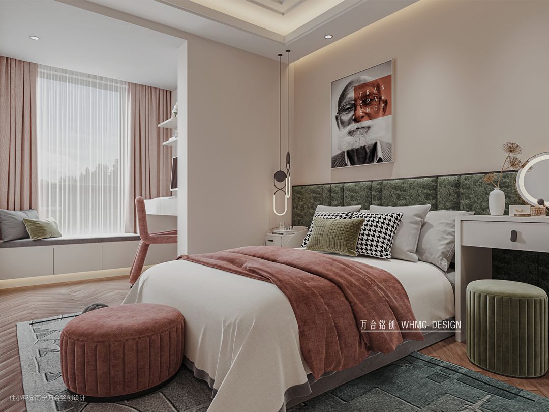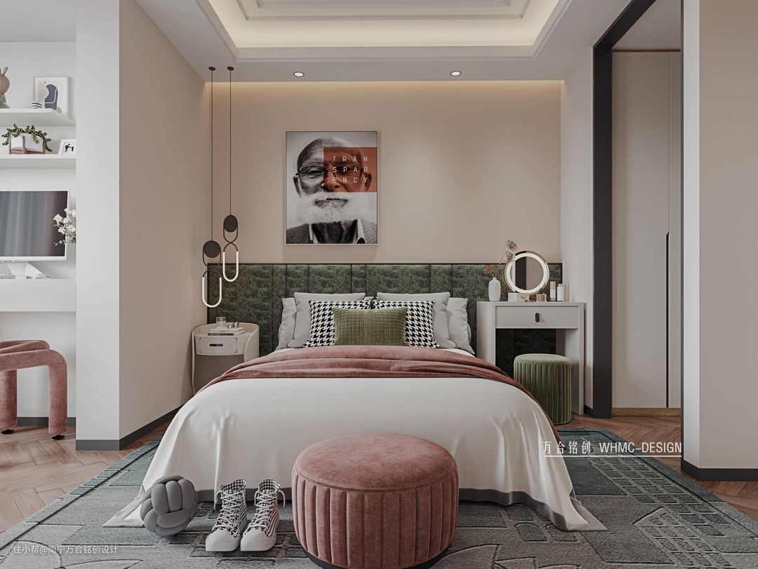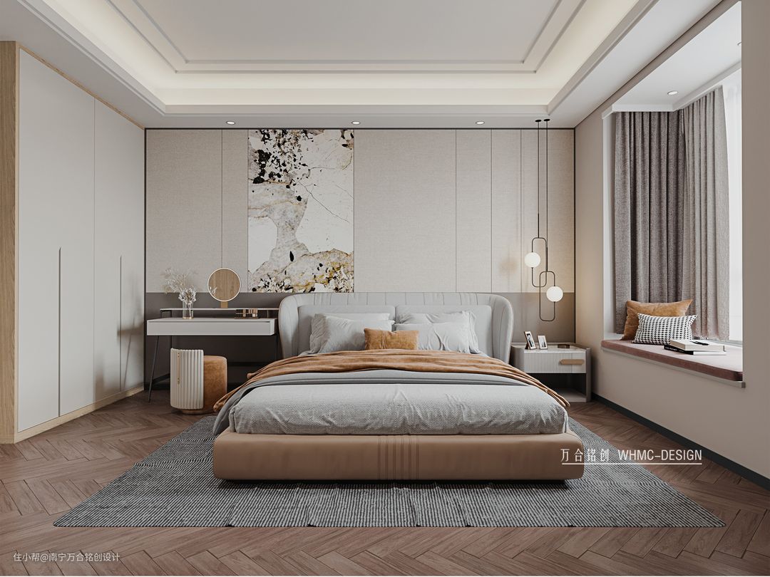 整体空间太单调, 背景墙使用了一面富有纹理变化的大理石做点缀,石材的魅力还是很吸引人的;无主灯的卧室设计能够营造更加惬意的氛围