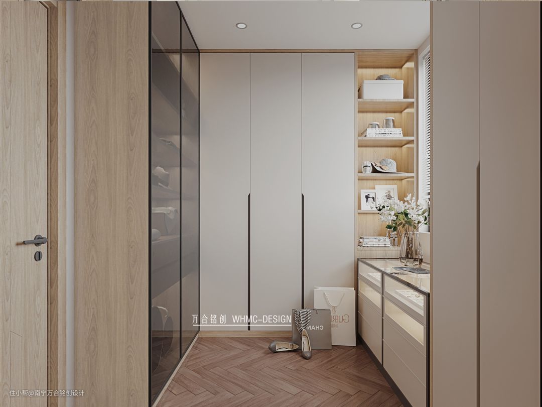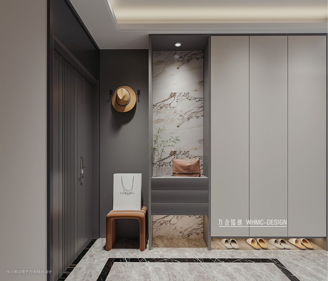 入门设计了一个可以挂置帽子衣物的区域,下方的可移动式换鞋凳,可以在挂长衣时随意挪动位置;鞋柜左侧增添一个玄关用白色大理石做背景,在射灯的照射下整体大气不失质感