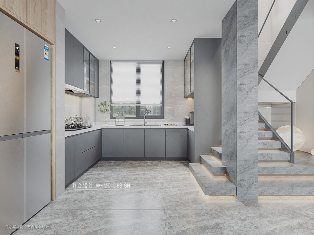 开放式厨房的设计更加不显拥挤,高级灰是不会过时的色彩,厨房地面通通铺了灰色大理石 耐脏又实用,而且当有灰尘时也不像白色的地面一样明显哦