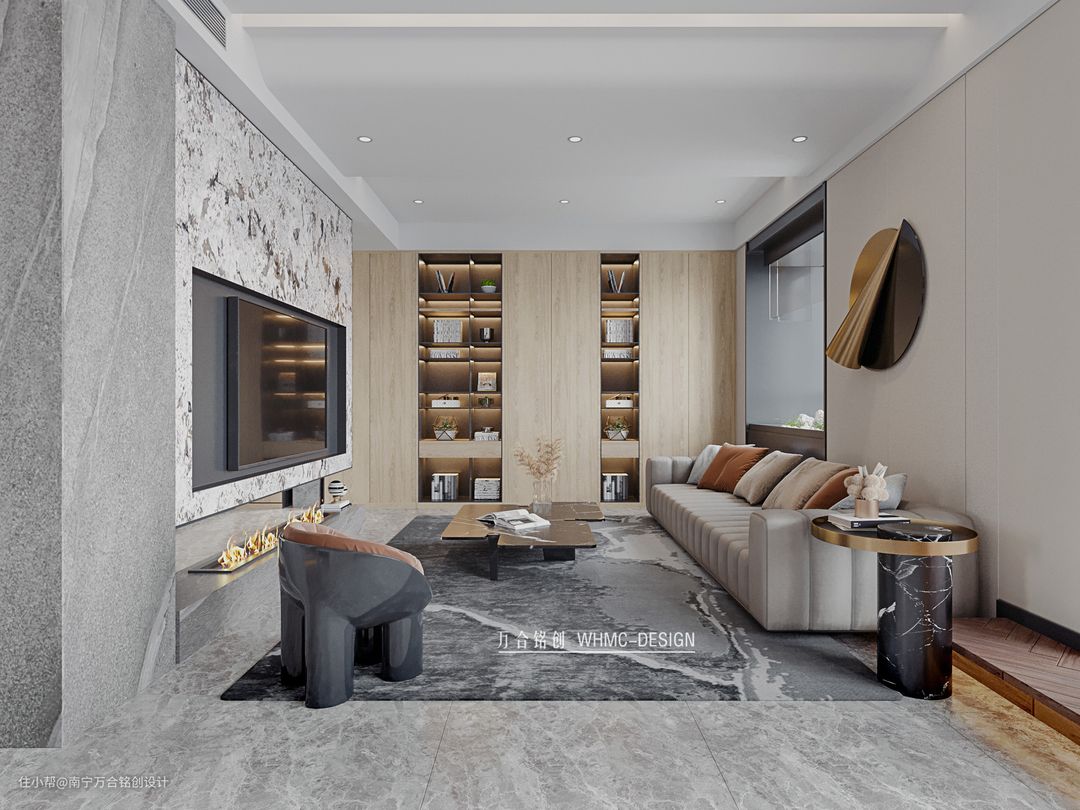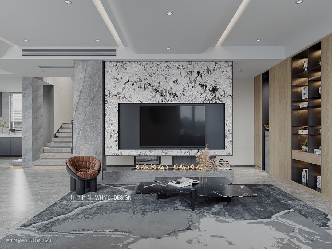 悬空电视背景墙选用大理石石材,保留了天然石材独有的别具一格的纹理特色和细腻质感,下部悬空保持了空间的通透感