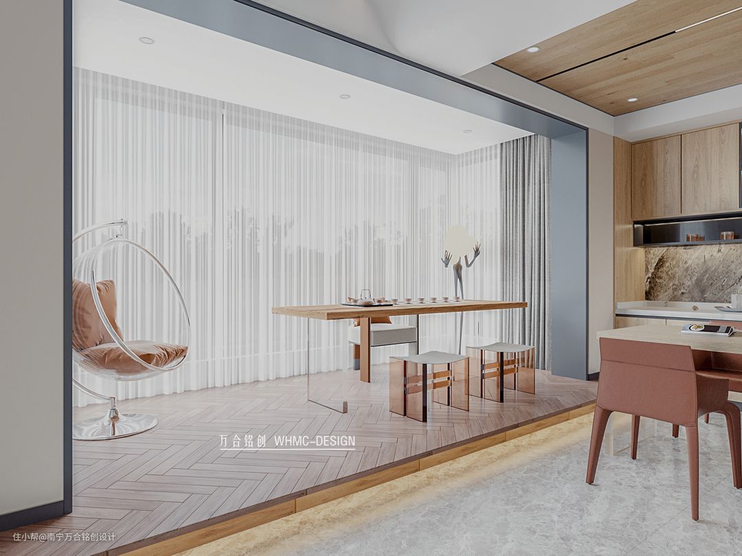 原阳台抬高做了个悠闲茶室放置了一个摇篮椅,茶色亚克力的椅子搭配原木色桌子,给人的感觉非常轻盈不笨重,舒适自由之感