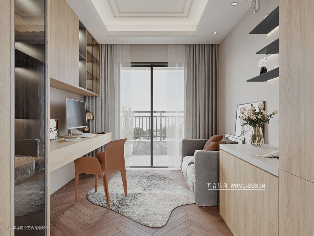 书房空间沿阳台设计,保留足够的采光,沙发可以在工作劳累之余更好的放松休息;绿植能够让人的心情变得舒缓,更好的工作