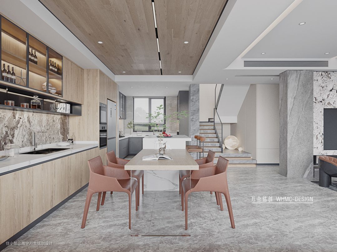餐厅吊顶使用了木饰面装饰,时尚美观营造更加温馨的用餐氛围;低饱和度的红色餐椅,为整体微微暗沉的空间赋予明亮的色彩,增加跳动感