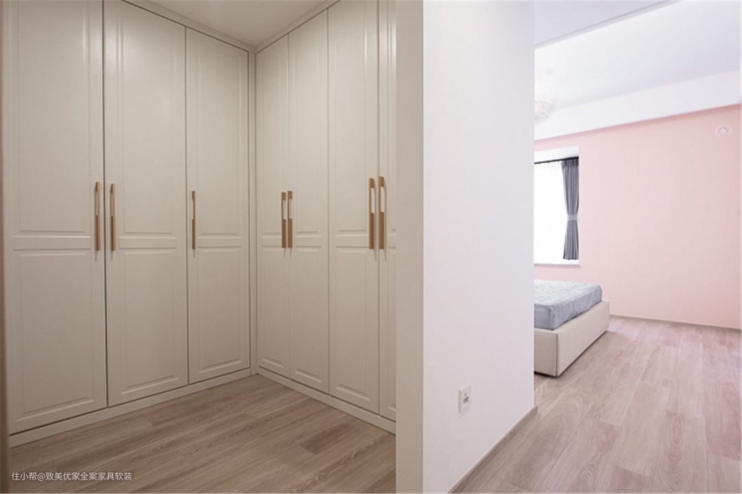 相比于房间内大大小小的柜子,衣帽间的优势非常明显:做到服装饰品的集中收纳,减少过多琐碎物件对房间的瓜分,空间视觉感更清爽,同时使用率也大大提高。