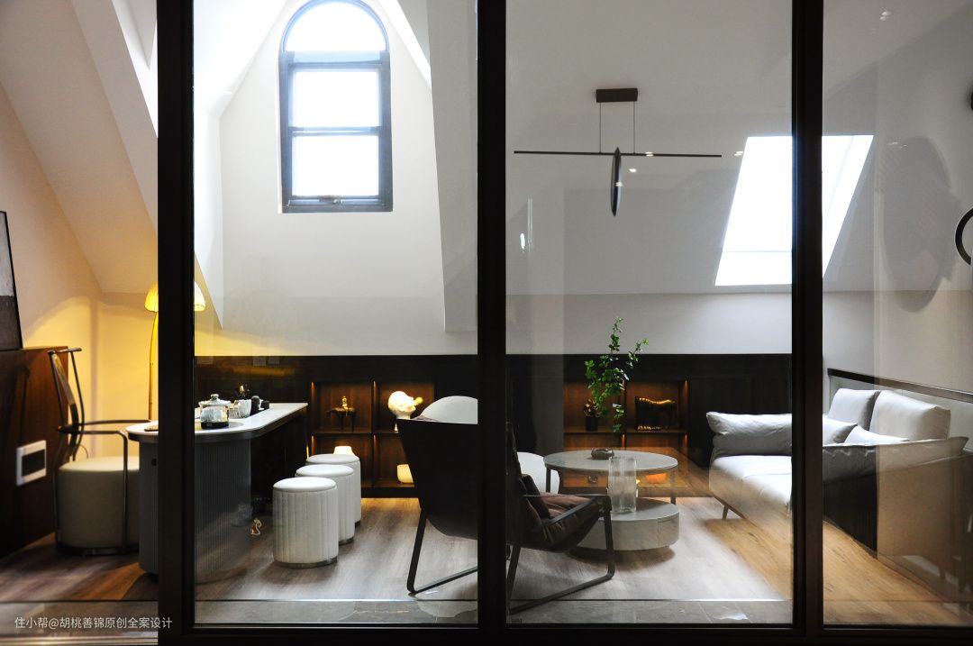 以小型弧形窗为中心,分割茶室与会客厅。拆除墙体,换上玻璃门,光线如水流般涌入卧室,卧室也拥有了自然光亮。