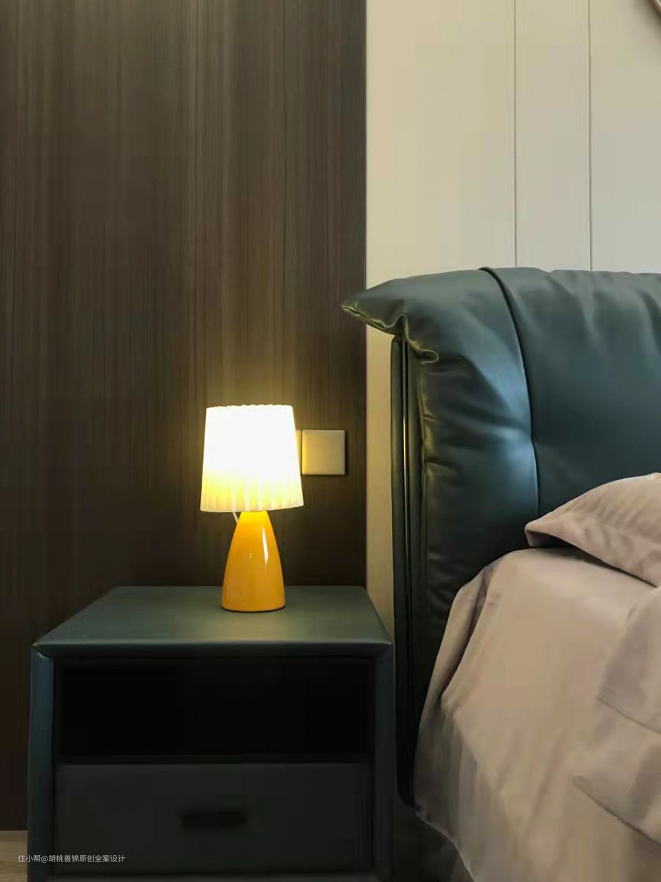 次卧的设计同样不失格调,暖色调的软装体现暖暖的生活氛围。床头采用射灯+线性灯的设计,简约的设计,极致的时尚。