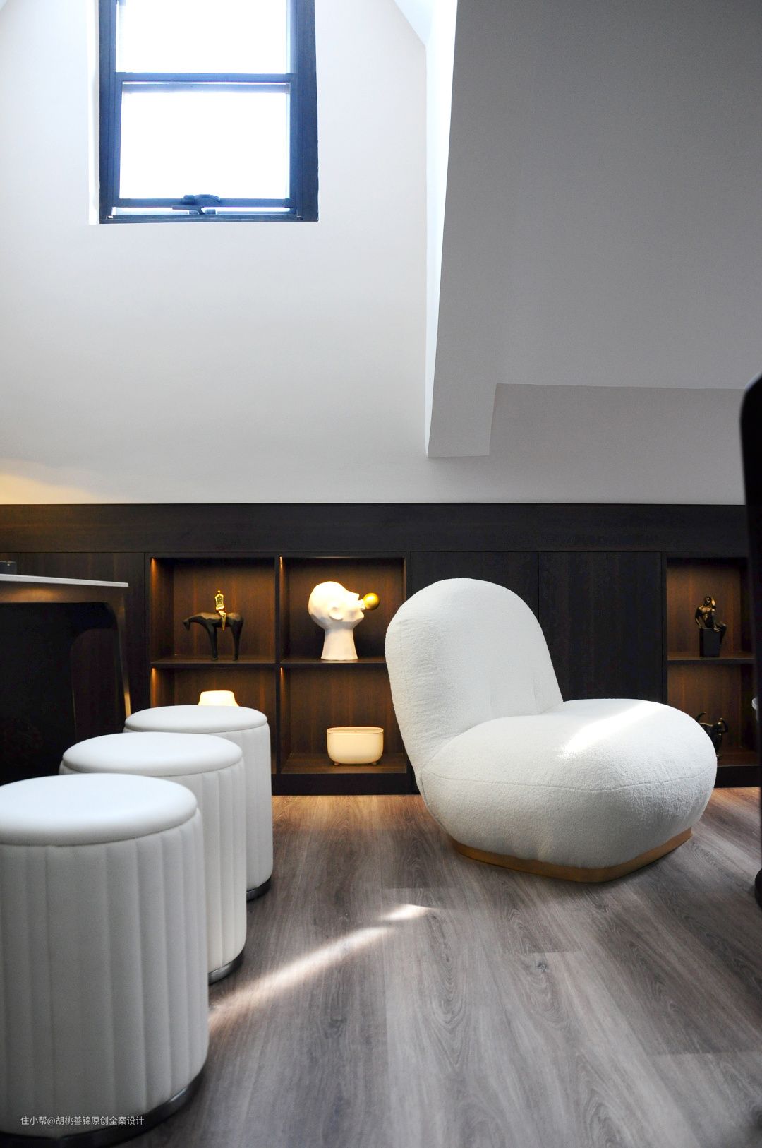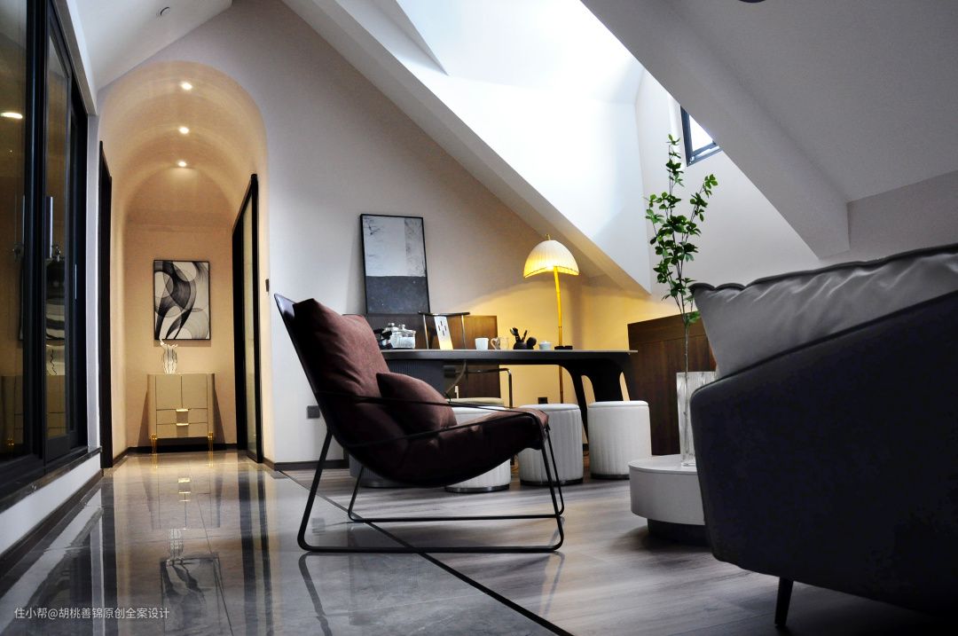 小型会客厅位于二楼楼梯口处,白色大理石桌面配上米白色皮沙发,有质感又时尚。温润灯光,营造低彩度的暖心氛围,再加一些业主挚爱的精致摆件,点缀在柜体与台面,沉稳而又不失优雅。