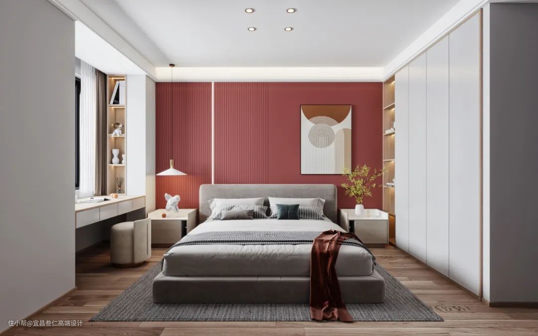 讲求舒适度的主卧空间,以温柔粉渲染一片轻柔宁静,植入现代经典元素烘托悠然氛围。并切齐水平轴面开设出一体化书桌,给予屋主一个歇心坐卧与阅读的空间,美观性与实用性兼得。
