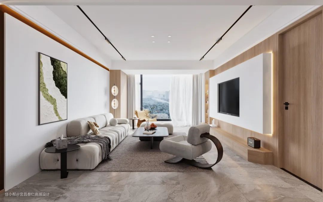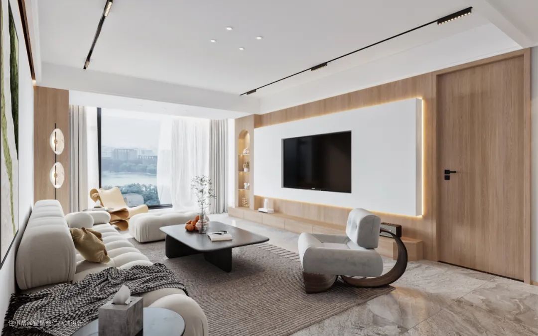 客厅遵循简约的设计理念,电视背景墙的呈现为简为美。白色背景+原木电视柜的组合,既保障了观影、储物以及收藏的功能,也让整个空间更显干净大气。