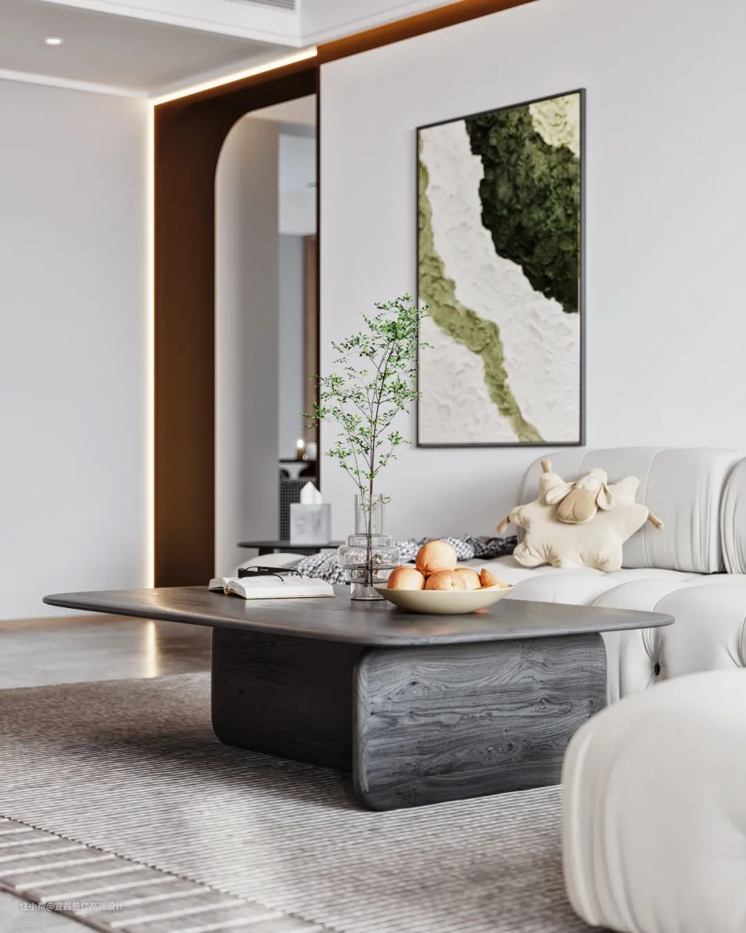 绿植与装饰画相映成趣,以鲜明的绿色凝聚一抹吸睛的个性焦点,为整个客厅空间注入了活力与生机。在澄净光束的温柔投射下,呈现出一幅简而不减的静美场景。