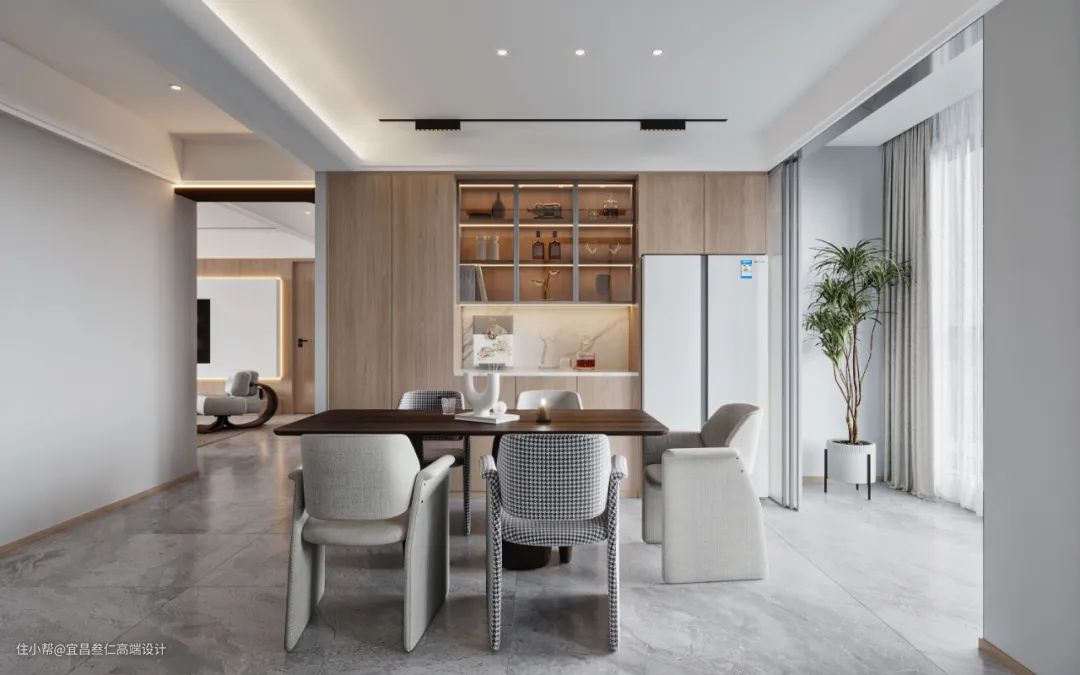 屋主希望餐厅功能健全,能够满足存放餐具美酒、储存食物的要求,所以依循墙壁打造了一面到顶的餐边柜,在有效利用纵向空间的同时,也完美地解决了收纳的难题。