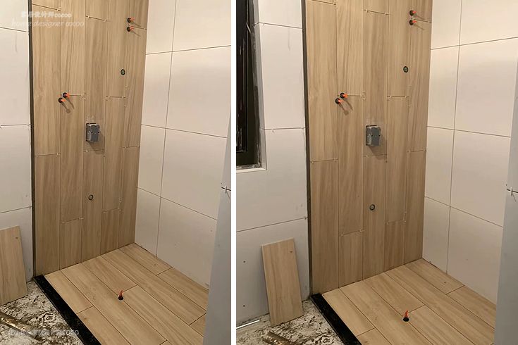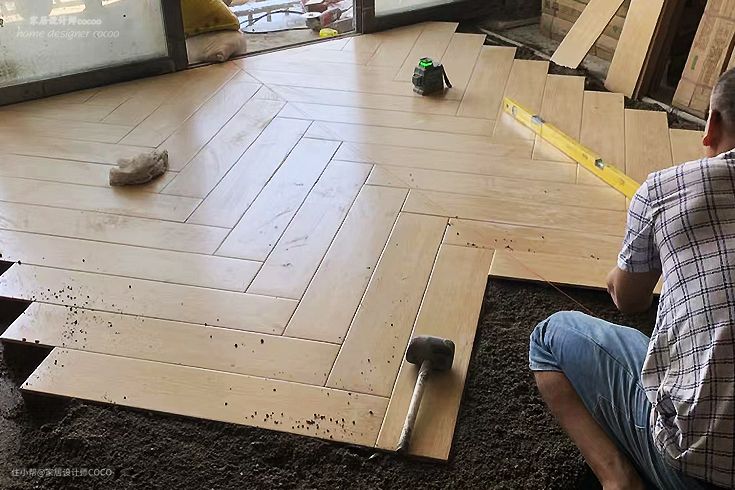 369是比较常规的铺贴方法,由于我家的砖长度不是90cm不容易等分成三份,所以在铺贴的时候,灵活的改成了2468步步高铺法,这种铺法比28分或工字拼更加自然。
