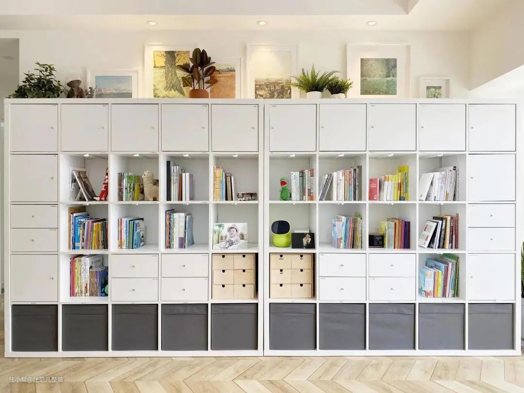 之前介绍过的收纳师万万的家,考虑到全家人的习惯,客厅核心区就用两组宜家卡莱克大柜子组装而成收纳“大胃王”。