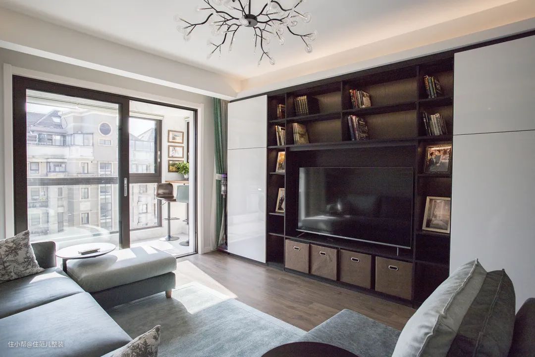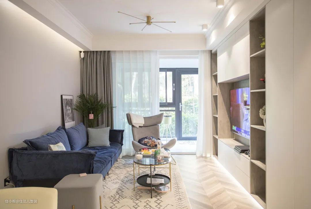 60-90㎡的家,客厅一般是15-20㎡,小客厅在布置的时候,就不得不把一些功能叠加起来,电视、沙发紧凑布局,收纳也尽量隐藏起来才不显拥挤;