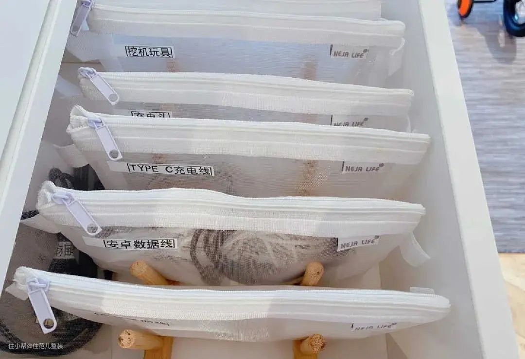 内部用透明文具袋分类,每一个袋子上都有标签,直接装进去就可以了,老人孩子都很容易操作。