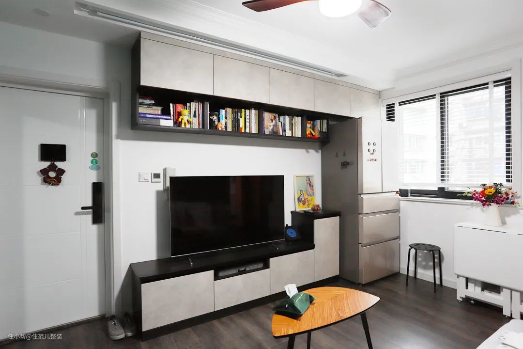 相比起左一个柜子右一个柜子,直接在客厅里设计一整面的大柜子就能化零为整,满足全屋收纳,是非常节约空间的做法,小户型的首选了。