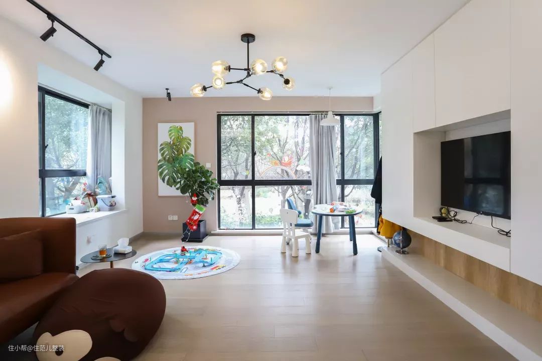 厅几乎把所有的公共空间全部融合了起来,如果仍然是大沙发+大茶几+电视墙就挤满客厅,相当于除了看电视之外,就不能呆在客厅里了。